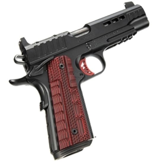 • The frame features aggressive Stiplex texturing on the front strap for enhanced control, red and black G10 grips for a secure hold and a 1913 Picatinny rail to easily mount lights, lasers or other accessories