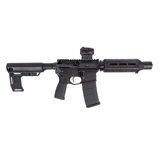 Barrel: 7″ 4150V Chrome Moly vanadium steel for accuracy and durability and chambered in 5.56 NATO with a 1 in 7″ twist. Pistol length gas barrel is finished off with a Magpul MOE M-Lok carbine length handguard, a low profile gas block and a patent pending PSA muzzle device designed to hold the handguard endcap in place.