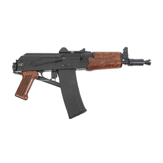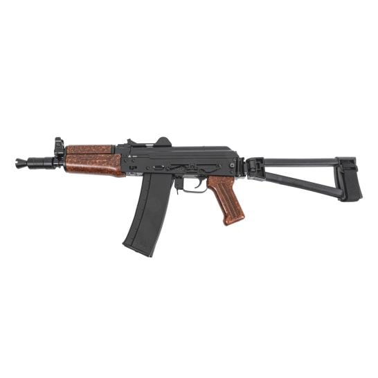 The Soviet Arms AKS-74U “Krinkov” pistol features a side folding rear trunnion, hinged dustcover, and short barrel for the most compact AK PSA has offered to date. This pistol is equipped with a black triangle side folding pistol brace, hinged dustcover with integrated rear sight, and “bakelite” wood furniture. The original AKS-74U was adopted in 1979 to bridge the gap between a sub gun and a full-length rifle. This Soviet Arms AKS-74U is chambered in 5.56×45 and still maintains all the charm and aesthetic of the original 5.45x39mm Krinkov, but in an easier to obtain caliber.